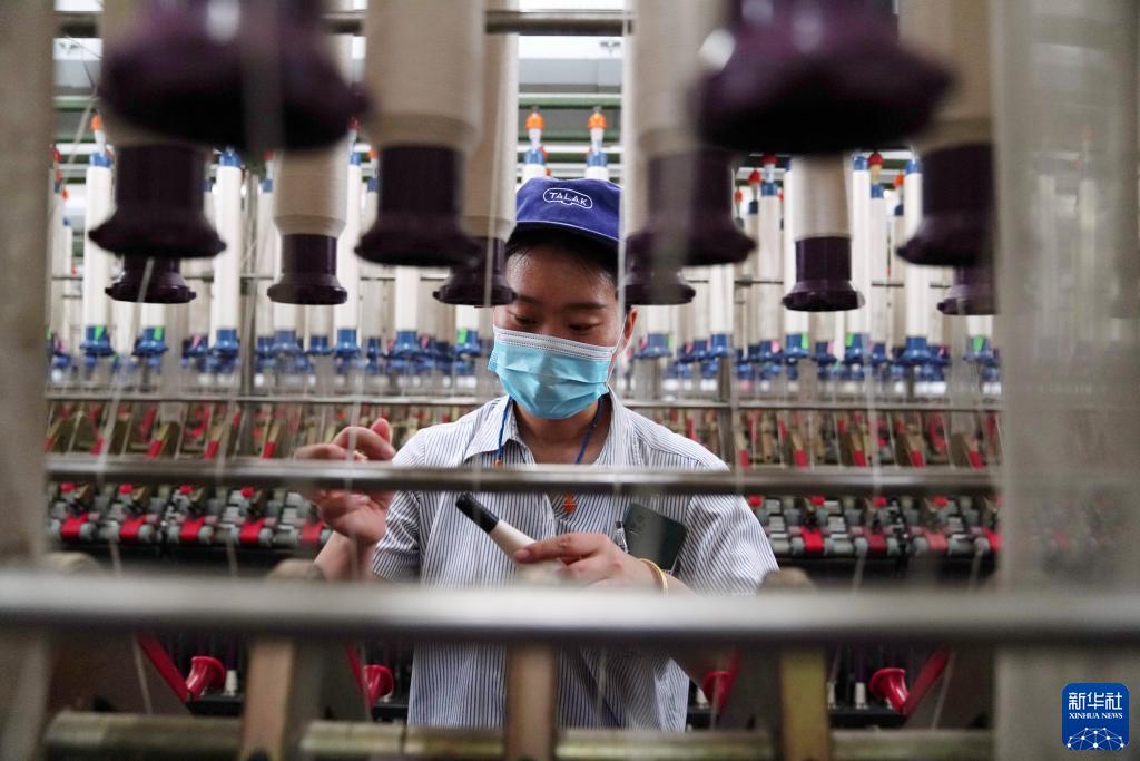 5月8日,在無(wú)錫一棉紡織集團長(cháng)江車(chē)間,工人在特高支紗生產(chǎn)線(xiàn)上作業(yè)。該生產(chǎn)線(xiàn)可批量生產(chǎn)達到世界領(lǐng)先水平的300支純棉紗線(xiàn)。