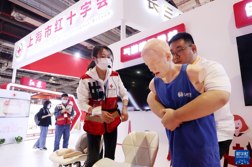 5月8日,一位參觀(guān)者在工作人員指導下體驗氣道梗阻應急救援操作。