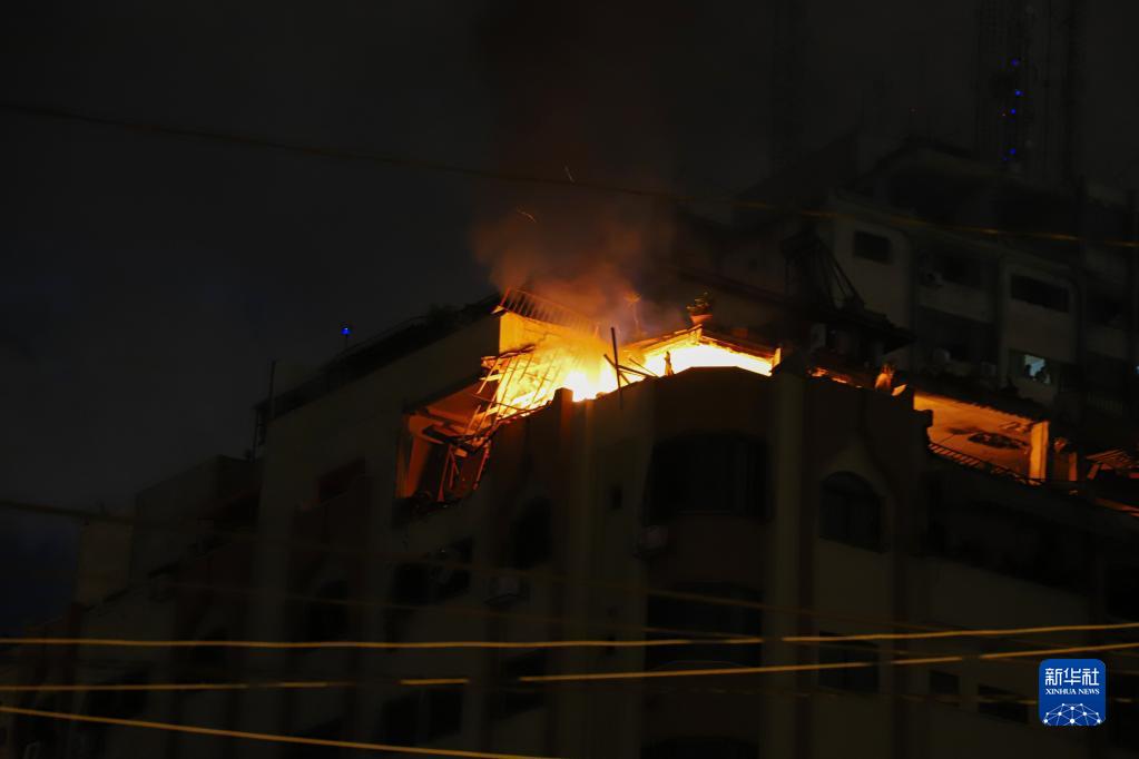 這是5月9日在加沙城拍攝的遭到空襲后失火的建筑。