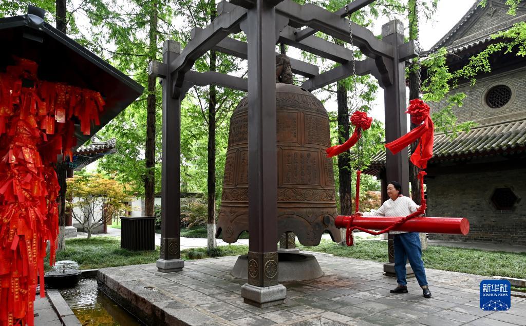 游客在西安薦福寺內敲鐘祈福(5月8日攝)。薦福寺鐘樓內的古鐘與小雁塔曾一起形成了“關(guān)中八景”之一的“雁塔晨鐘”。