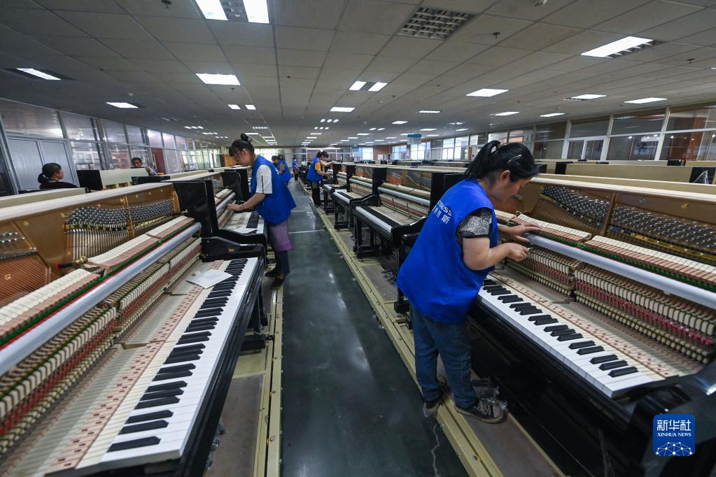 5月8日,在位于德清縣洛舍鎮的浙江樂(lè )韻鋼琴有限公司車(chē)間內,工人在生產(chǎn)線(xiàn)上進(jìn)行鋼琴的總裝整理工作。