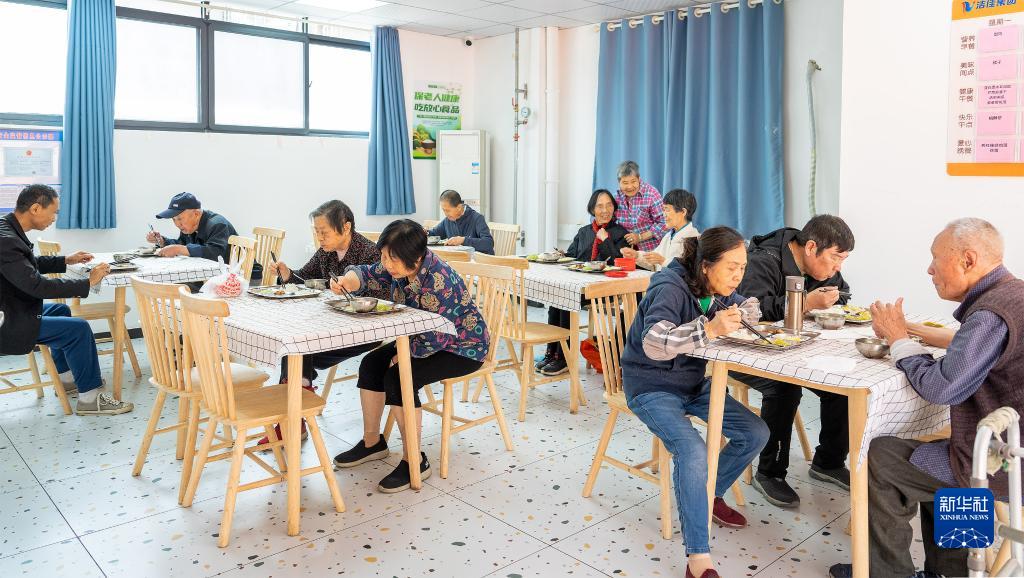 5月9日,在江西省南昌市青云譜區三家店街道南蓮社區嵌入式養老院,老人們正在用餐室吃飯。