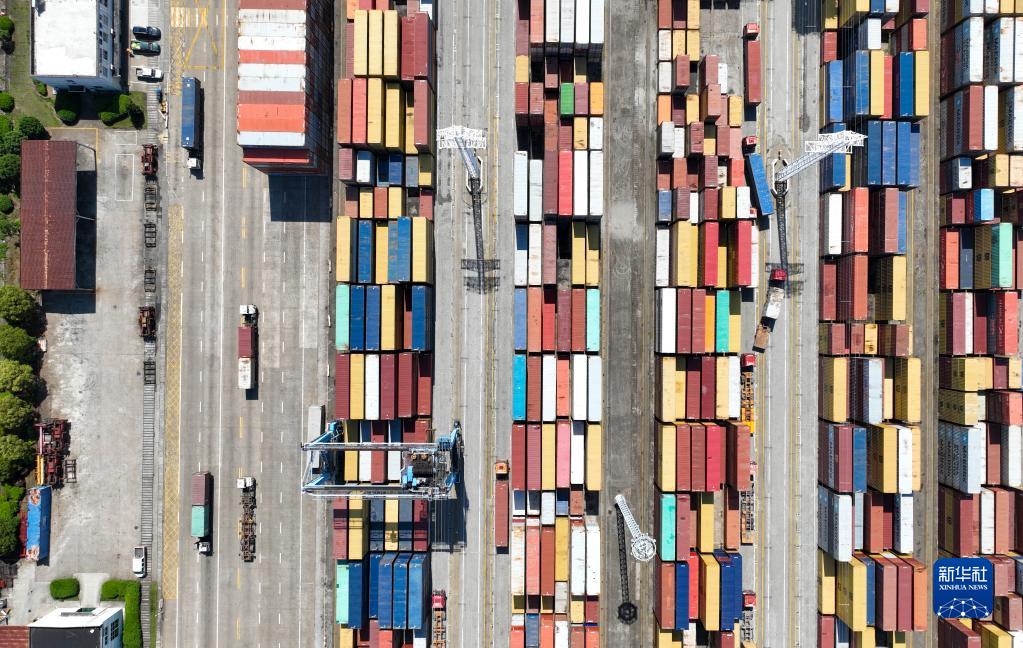5月9日,卡車(chē)在寧波舟山港穿山港區運輸集裝箱貨物(無(wú)人機照片)。