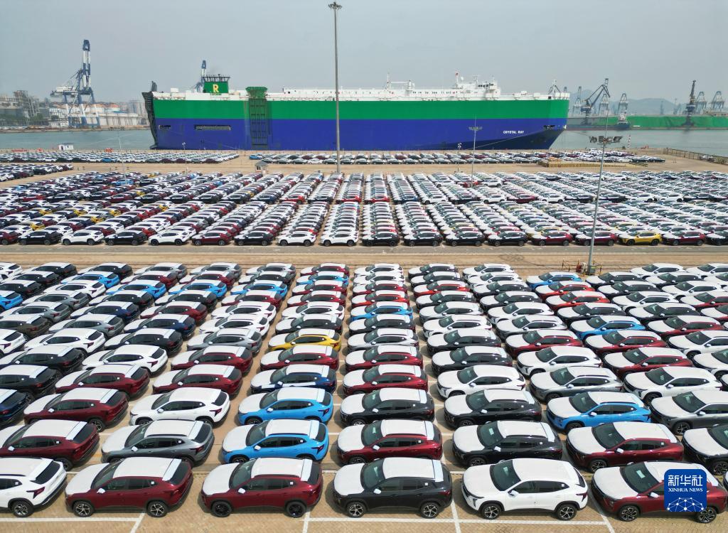 5月9日,在山東港口煙臺港,大批出口商品車(chē)集結到港準備通過(guò)汽車(chē)滾裝船發(fā)運(無(wú)人機照片)。
