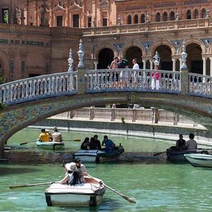 5月7日,人們在西班牙塞維利亞街頭乘涼。