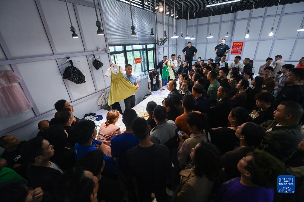 5月10日,在位于湖州吳興區織里鎮的織里國際輕紡城內,商家在進(jìn)行新款樣衣的展示。