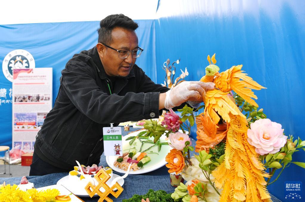 5月10日,西藏技師學(xué)院一名老師擺放食品雕刻藝術(shù)作品。