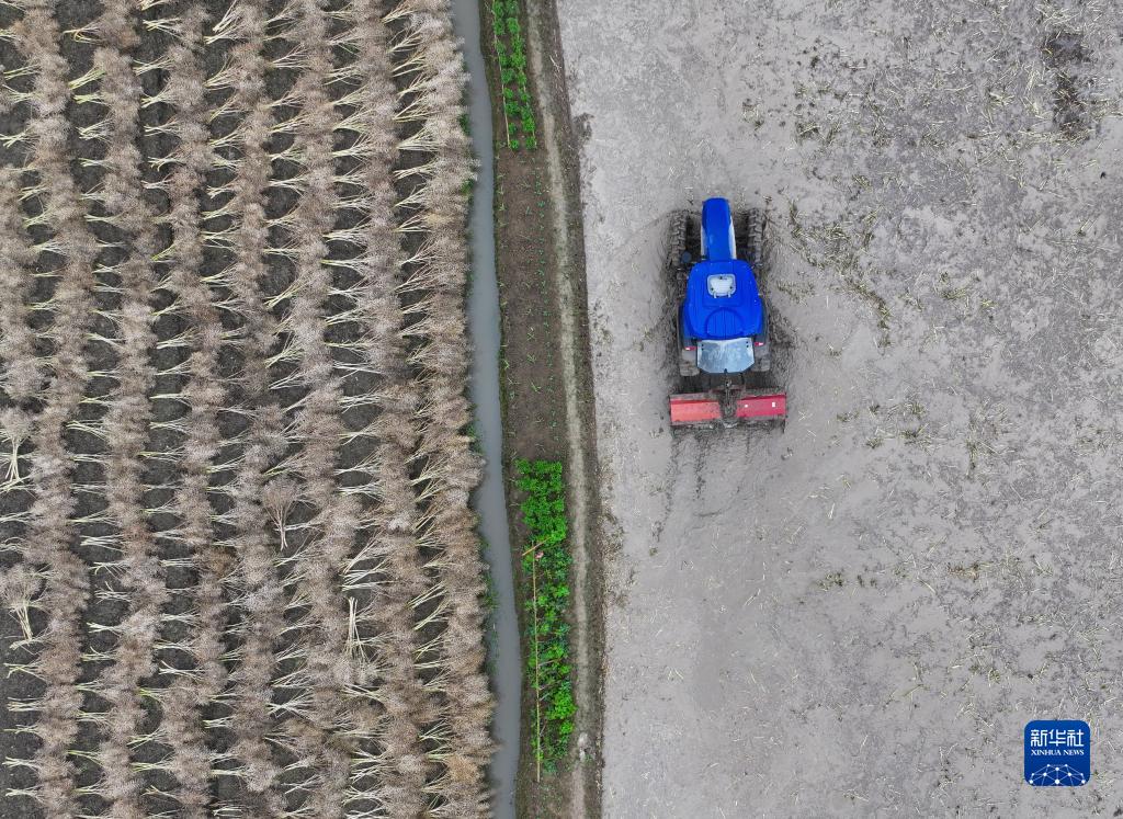 5月9日,四川省邛崍市桑園鎮農民駕駛拖拉機進(jìn)行打漿作業(yè)。