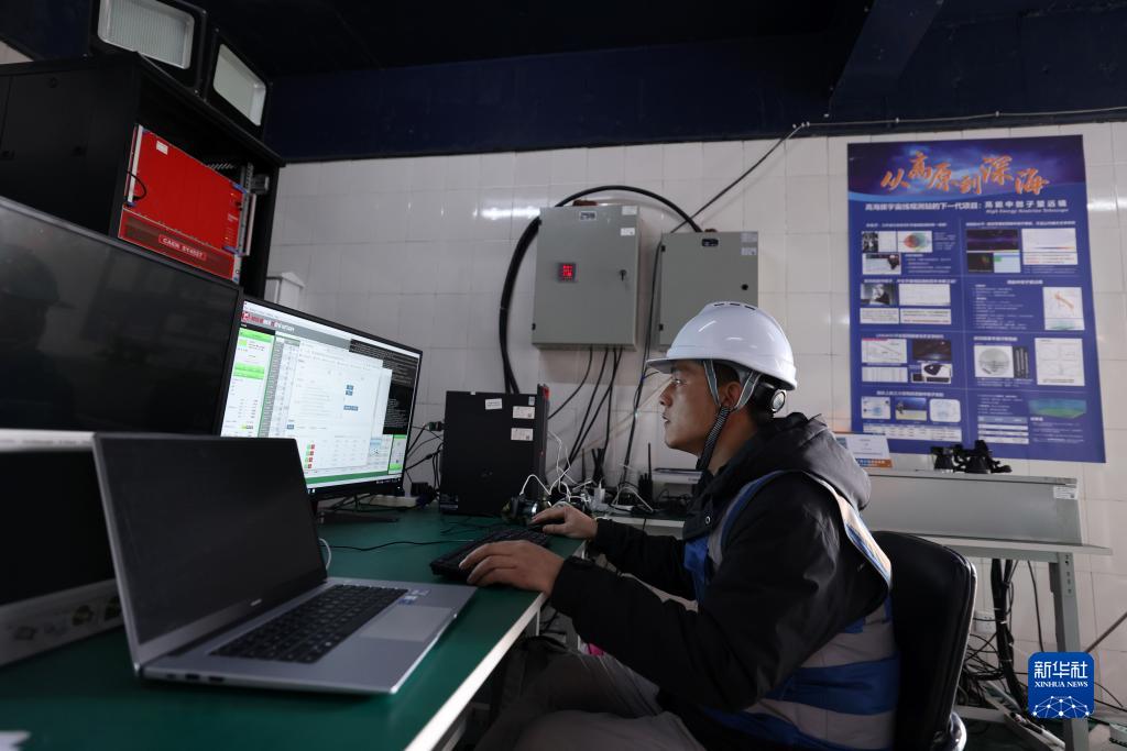4月22日,工作人員在高海拔宇宙線(xiàn)觀(guān)測站觀(guān)測基地水切倫科夫探測器陣列處理實(shí)驗數據。