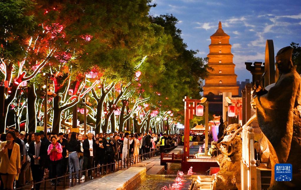 游客在西安大唐不夜城游覽(5月8日攝)。
