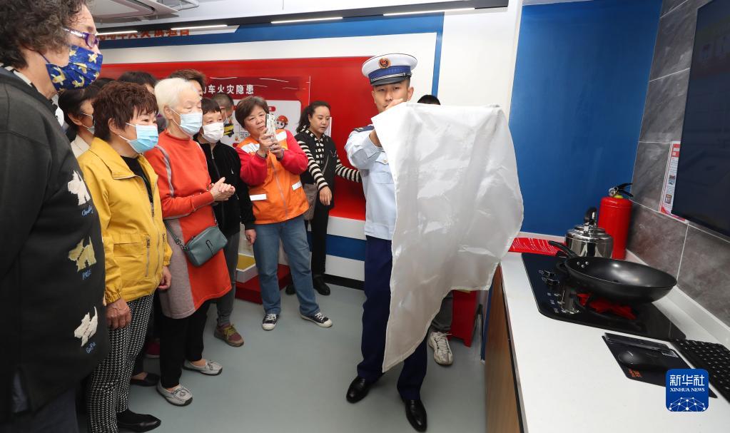5月11日,長(cháng)寧區消防救援支隊的消防員向社區居民演示廚房火災中滅火毯的使用技巧。