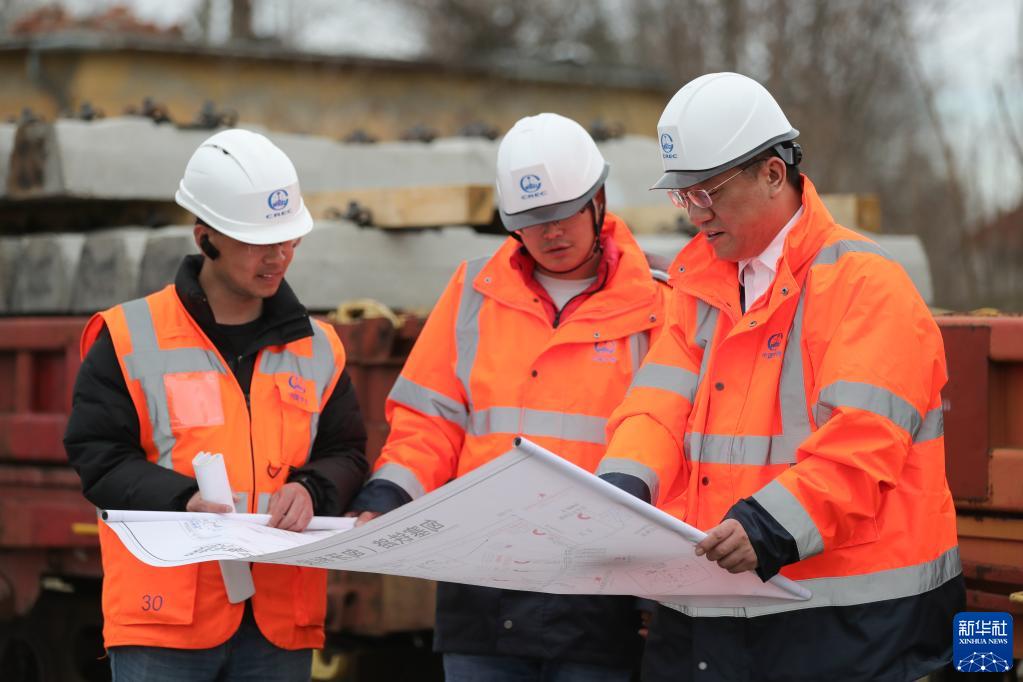 2月22日,陳仲亮(右一)在匈牙利代萊吉哈佐的匈塞鐵路匈牙利段工地與同事查看施工圖紙。