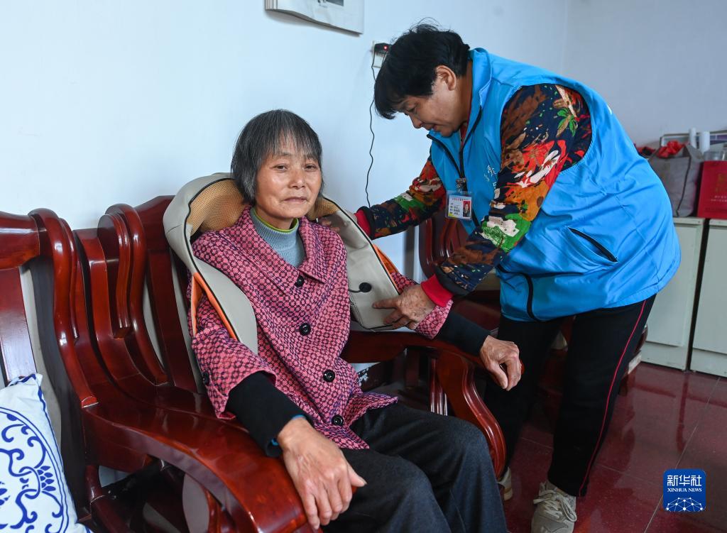5月11日,在杭州市臨安區錦北街道龍馬村70歲的獨居老人郭香娣家里,助老員幫助老人使用按摩設備。郭香娣老人自從簽約了家庭養老床位服務(wù),政府配套提供了緊急呼叫器、紅外人體感知報警器、門(mén)磁探測器、智慧床墊等智能化設備和助行椅、床邊桌等適老化設備。