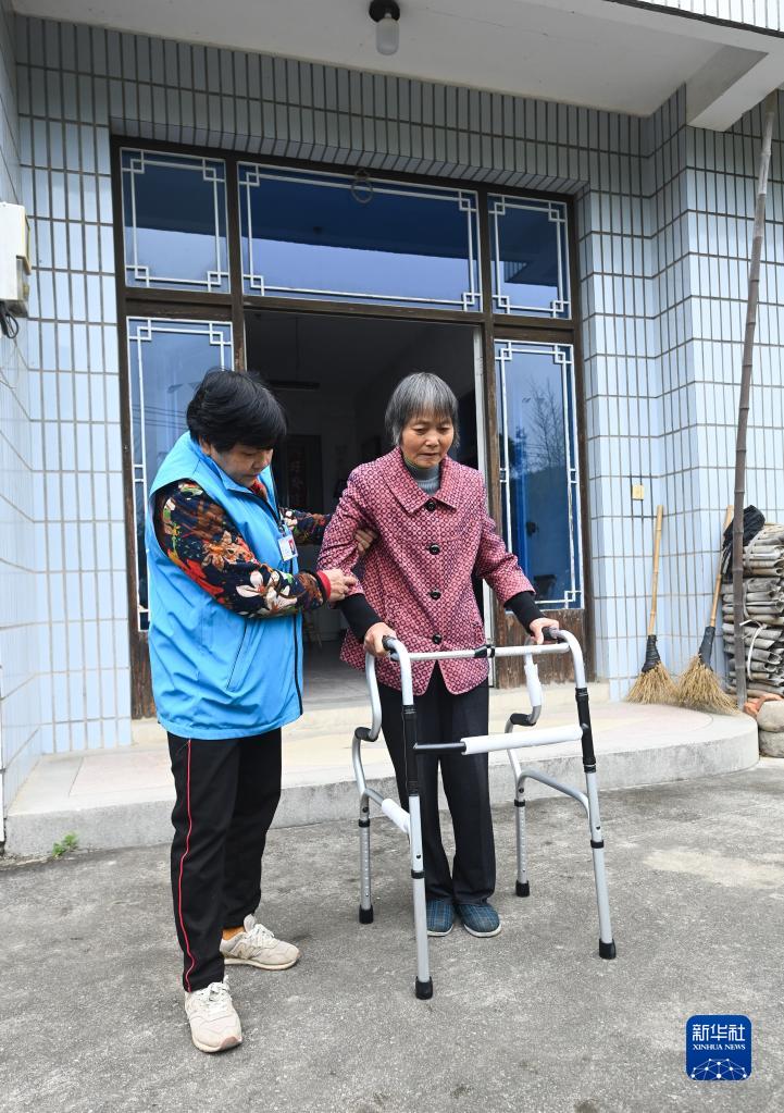 5月11日,在杭州市臨安區錦北街道龍馬村70歲的獨居老人郭香娣家里,護理員指導老人使用助行椅。