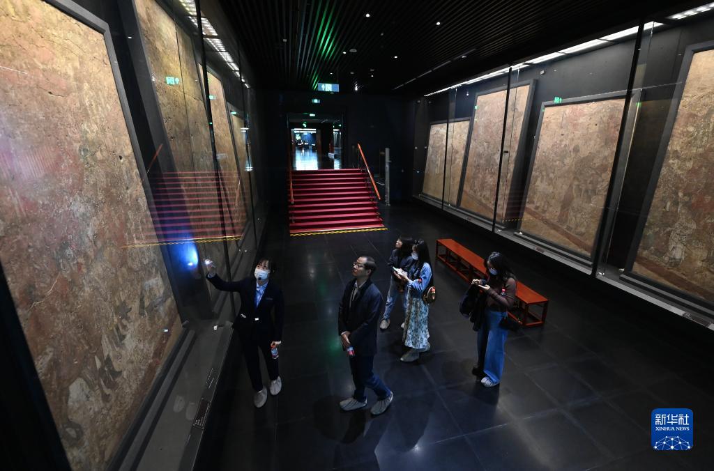 5月11日,游客在陜西歷史博物館唐代壁畫(huà)珍品館內參觀(guān)繪制于懿德太子墓的《闕樓儀仗圖》。