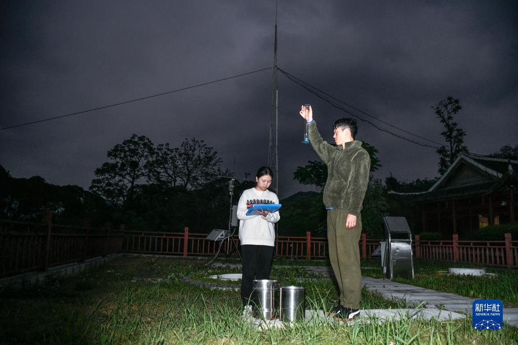 5月10日,水文工作人員在貴州省黃果樹(shù)水文監測站進(jìn)行降雨量觀(guān)測。