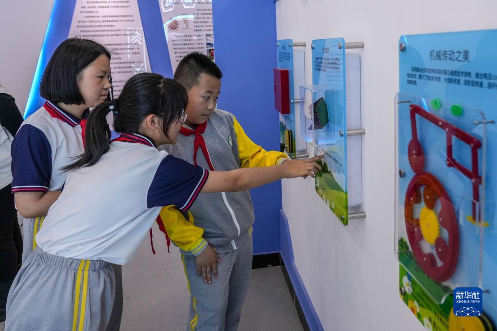 5月11日,小學(xué)生在馬店村科普體驗中心內體驗科普展品。