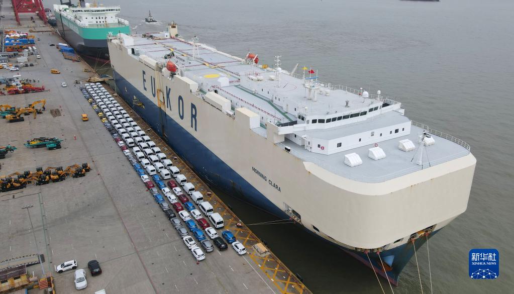 在位于上海外高橋的海通國際汽車(chē)碼頭,一批上汽集團乘用車(chē)停在碼頭上等待裝運,發(fā)往澳大利亞(無(wú)人機照片,2022年5月25日攝)。新華社記者 方喆 攝