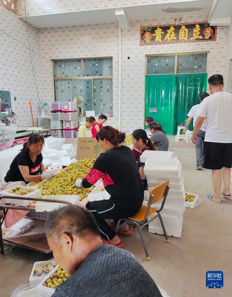 在陜西省渭南市大荔縣埝橋鎮北黃村,馬寧家屬與殘疾人朋友在馬寧家中一起打包冬棗(2020年7月9日攝)。