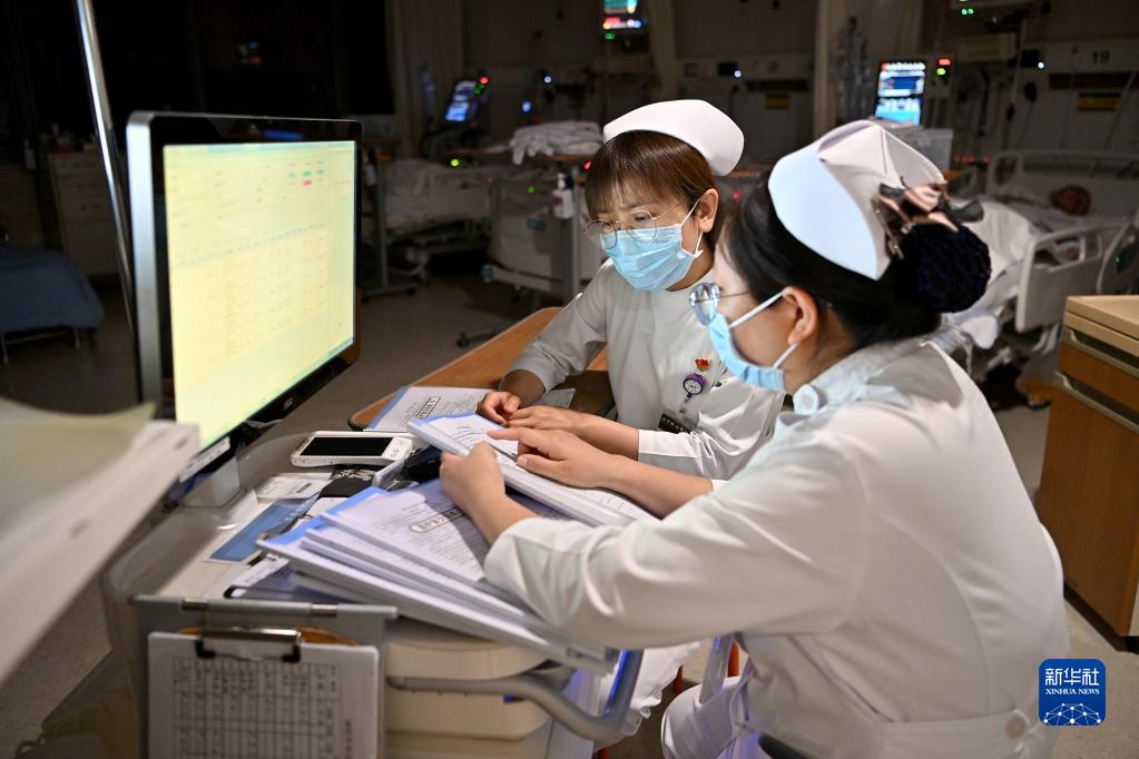 5月11日1時(shí)許,北京協(xié)和醫院神經(jīng)外科病房護士王立君(前)與同事孫燕霞交接重癥患者病情。