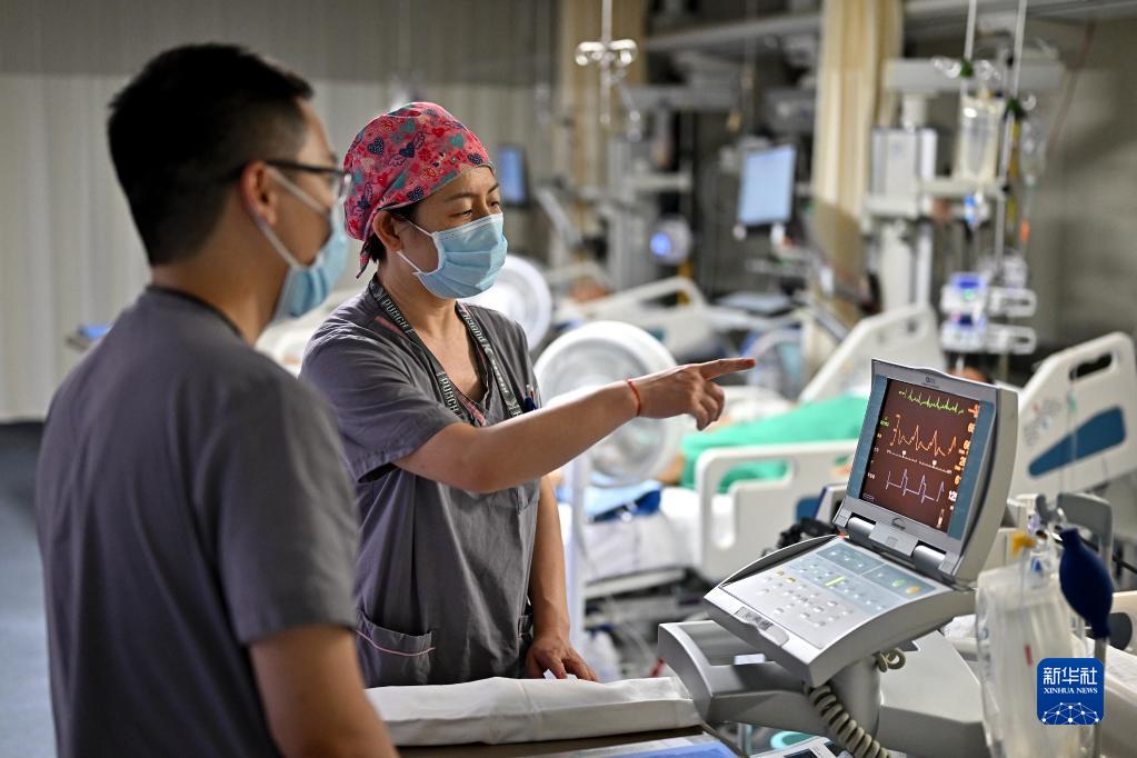 5月11日4時(shí)許,北京協(xié)和醫院內科重癥監護病房(MICU)護士雷寧(右)和醫生龍敬濤在討論患者病情。
