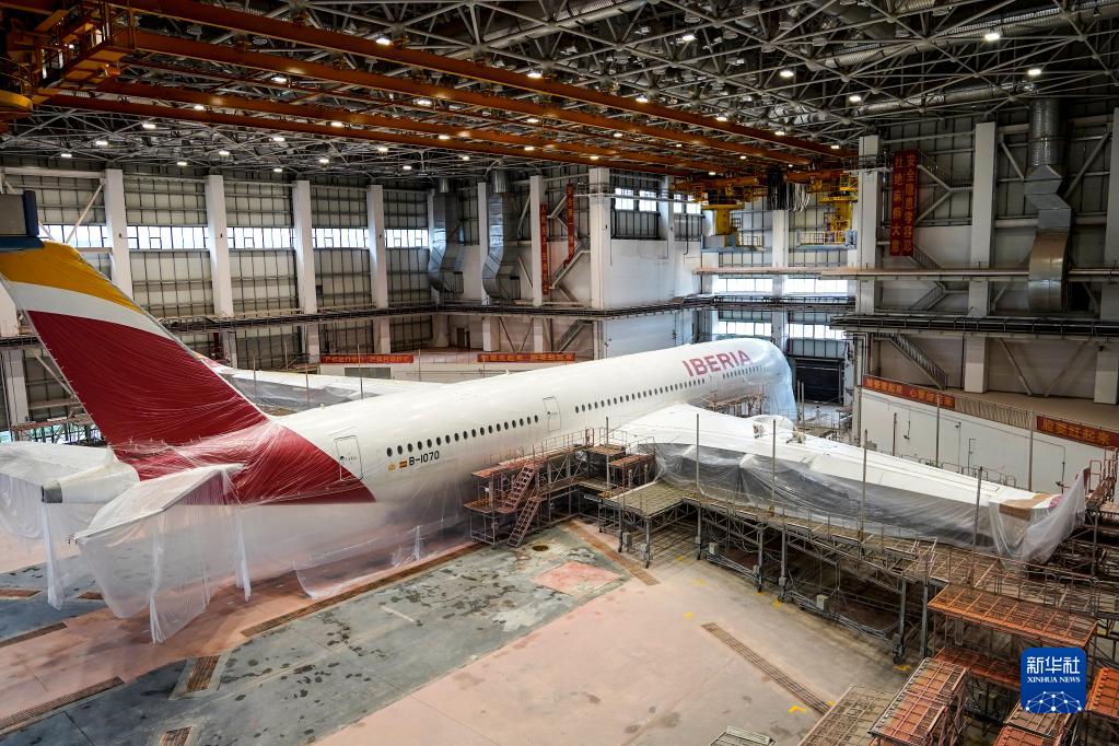 5月11日,噴涂作業(yè)員對空客A350-900寬體客機進(jìn)行打磨除漆。