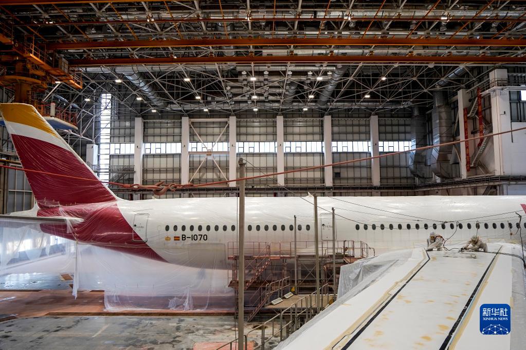5月11日,噴涂作業(yè)員對空客A350-900寬體客機進(jìn)行打磨除漆。