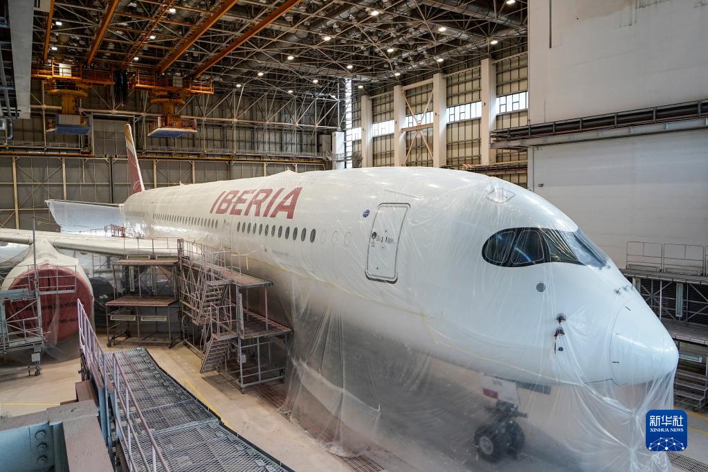 這是5月11日在海南自貿港一站式飛機維修產(chǎn)業(yè)基地內拍攝的空客A350-900寬體客機。