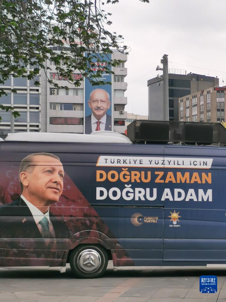 這是5月11日在土耳其安卡拉拍攝的埃爾多安和凱末爾·克勒奇達爾奧盧的競選海報(手機拍攝)。