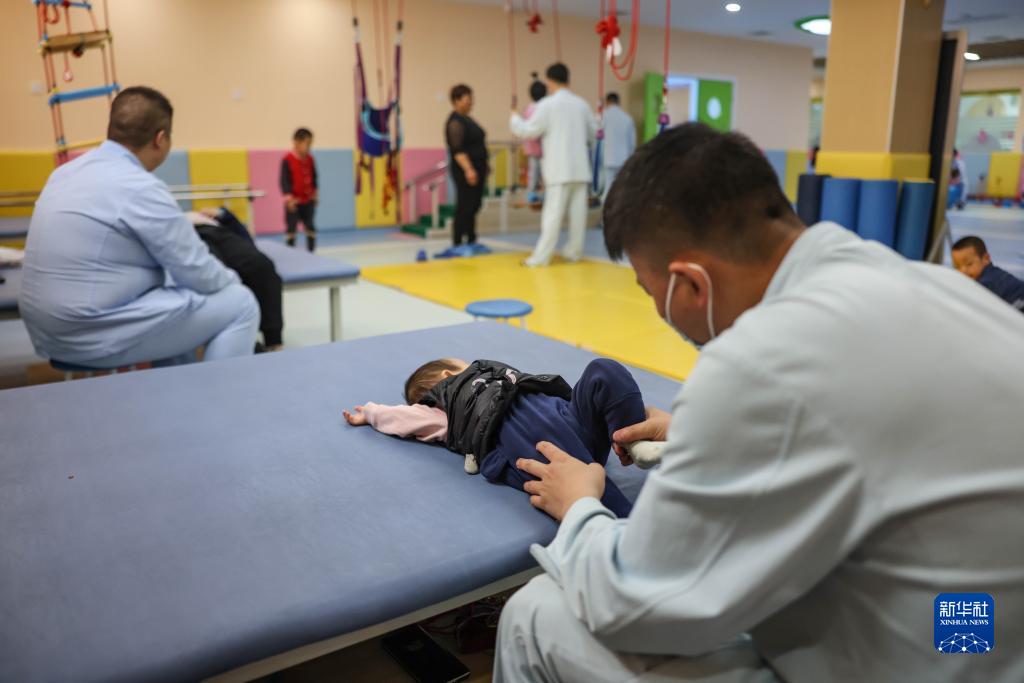 5月11日,康復治療師在渭南腦病康復醫院幫助患兒進(jìn)行下肢肌力主動(dòng)訓練。