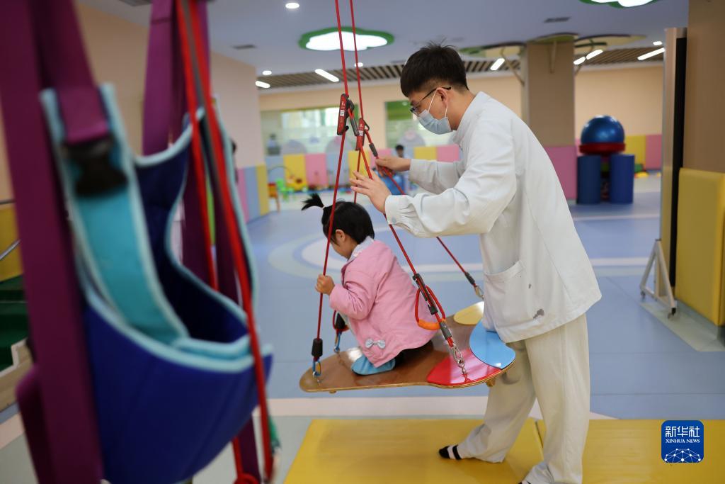 5月11日,康復治療師在渭南腦病康復醫院幫助患兒進(jìn)行蹲位平衡訓練。
