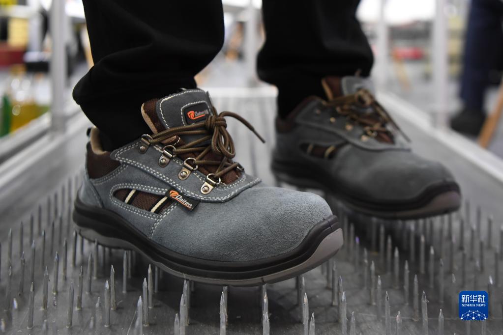 5月12日,參展商在長(cháng)沙國際工程機械展覽會(huì )現場(chǎng)展示一雙防刺穿勞保鞋。