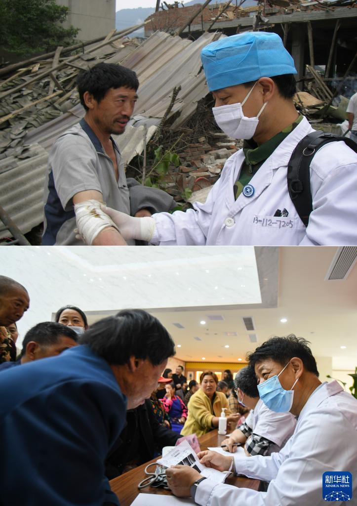 拼版照片:上圖是鐘朝輝(右)在四川省北川縣擂鼓鎮為地震傷員包扎傷口(2008年5月20日攝,新華社發(fā));下圖是北京大學(xué)人民醫院普外科主任醫師鐘朝輝(右一)在汶川縣中醫醫院開(kāi)展義診為患者查看檢驗報告(2023年5月9日新華社記者王曦攝)。