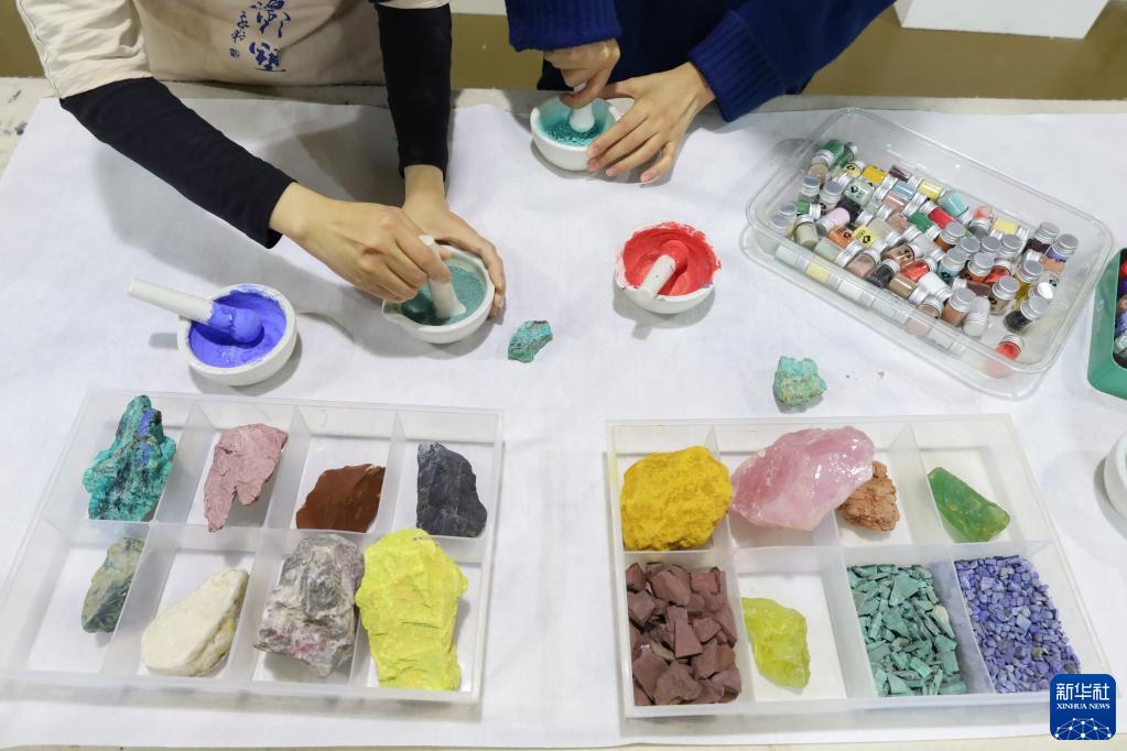 5月11日,學(xué)員在位于敦煌市的莫高里工匠村用天然礦石制作顏料。