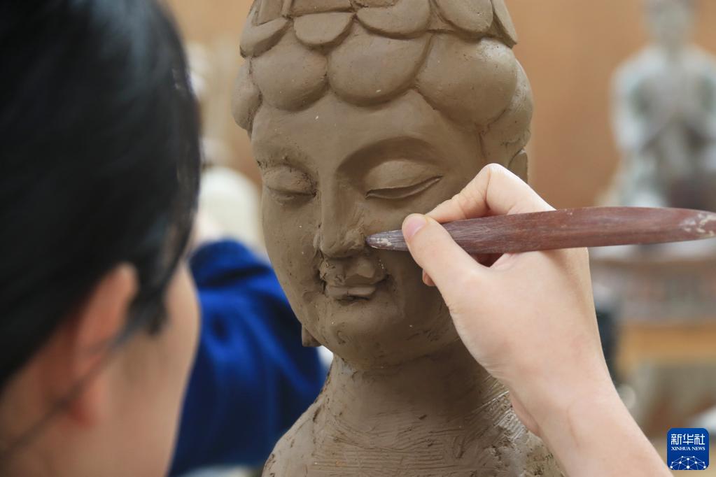 5月11日,學(xué)員在位于敦煌市的莫高里工匠村練習雕塑技藝。