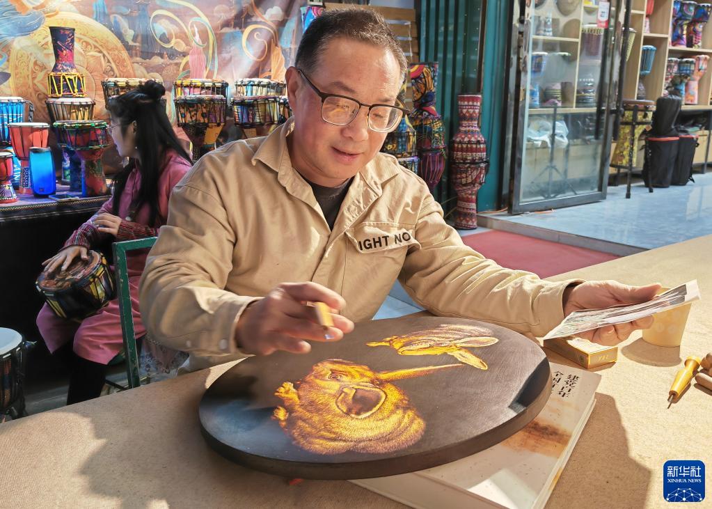 5月10日,工藝美術(shù)師申洪杰在敦煌夜市進(jìn)行敦煌木刻畫(huà)創(chuàng )作展示(手機照片)。