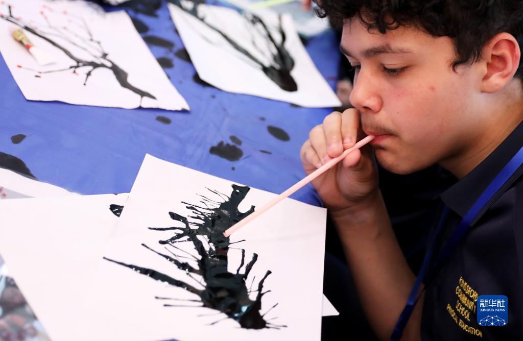 5月11日,在英國倫敦,一名學(xué)生在2023“國際中文日”英國主題活動(dòng)上體驗用吹墨方式作畫(huà)。
