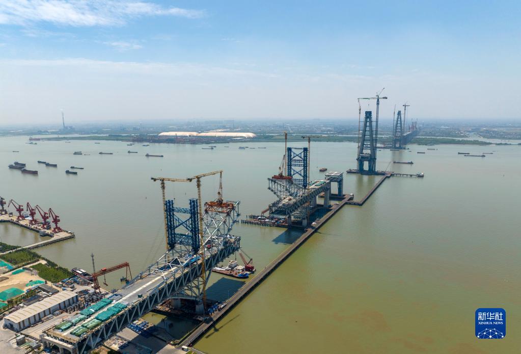 5月12日拍攝的常泰長(cháng)江大橋項目施工現場(chǎng)(無(wú)人機照片)。