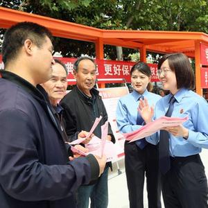 5月12日,在河南省洛陽(yáng)市汝陽(yáng)縣政府廣場(chǎng),洛陽(yáng)市司法局和汝陽(yáng)縣司法局普法宣傳志愿者向群眾發(fā)放民法典宣傳資料。