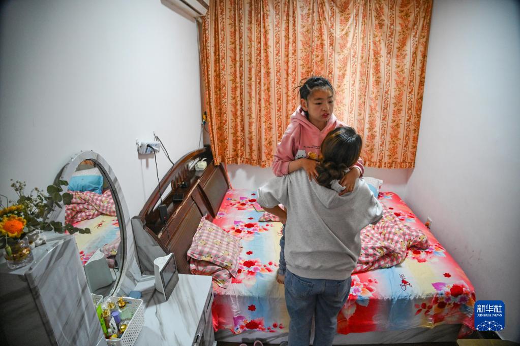 5月11日清晨,王鴿幫女兒趙懿菲穿衣服。