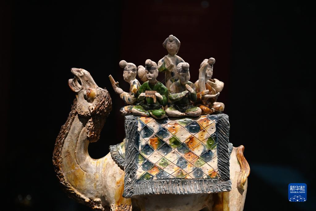 這是在陜西歷史博物館拍攝的唐三彩駱駝載樂(lè )俑(5月11日攝)。這件唐三彩駱駝載樂(lè )俑既是唐代文化藝術(shù)、制作工藝發(fā)達昌盛的重要物證,也見(jiàn)證了絲綢之路上藝術(shù)的交流與融合。