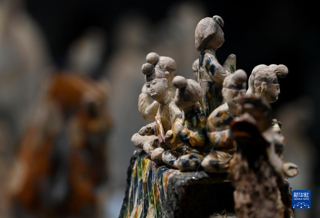 這是在陜西歷史博物館拍攝的唐三彩駱駝載樂(lè )俑(5月11日攝)。這件唐三彩駱駝載樂(lè )俑既是唐代文化藝術(shù)、制作工藝發(fā)達昌盛的重要物證,也見(jiàn)證了絲綢之路上藝術(shù)的交流與融合。