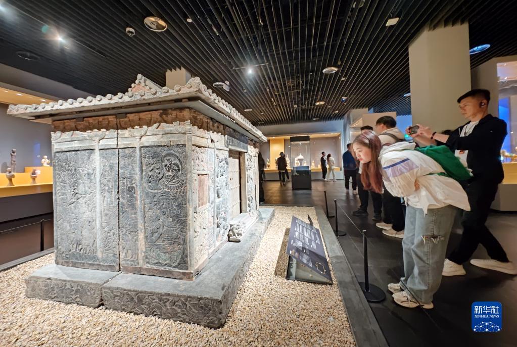 5月8日,游客在西安博物院參觀(guān)史君墓石槨。墓主史君是北周涼州薩保,粟特人。石槨整體為中國傳統歇山頂殿堂式建筑,四壁浮雕內容和風(fēng)格則帶有鮮明的西域特色。