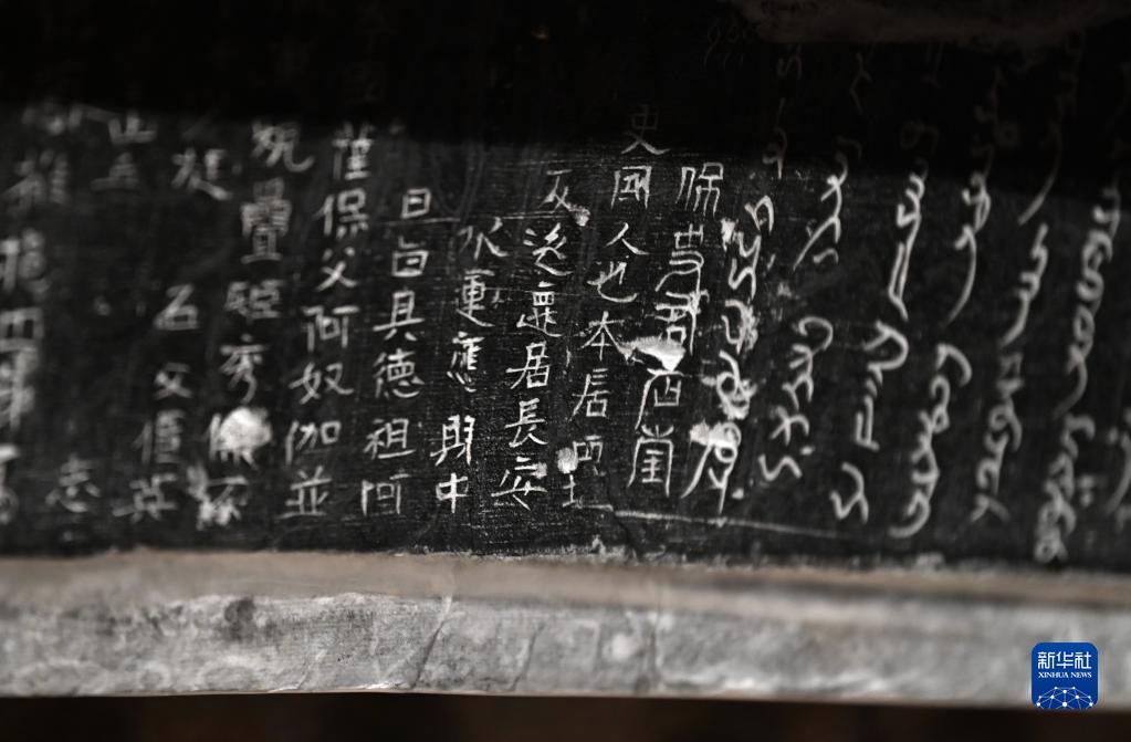這是在西安博物院展出的史君墓石槨,槨門(mén)門(mén)楣上用漢文和粟特文刻著(zhù)墓主墓志(5月8日攝)。墓主史君是北周涼州薩保,粟特人。石槨整體為中國傳統歇山頂殿堂式建筑,四壁浮雕內容和風(fēng)格則帶有鮮明的西域特色。