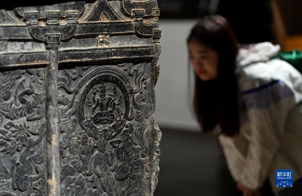 這是在西安博物院展出的史君墓石?。?月8日攝)。墓主史君是北周涼州薩保,粟特人。石槨整體為中國傳統歇山頂殿堂式建筑,四壁浮雕內容和風(fēng)格則帶有鮮明的西域特色。