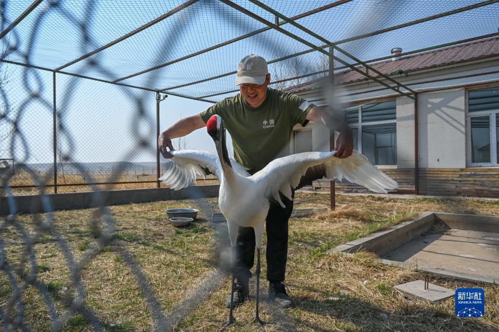 5月10日,徐沃德樂(lè )胡幫助一只救助的丹頂鶴張開(kāi)翅膀。