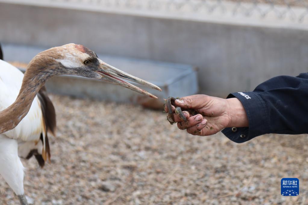 5月11日,徐沃德樂(lè )胡給救助的丹頂鶴喂食。