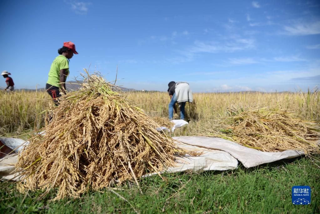 5月12日,在馬達加斯加首都塔那那利佛附近馬希奇鎮的中國國家雜交水稻工程技術(shù)研究中心非洲分中心,當地農民在雜交水稻高產(chǎn)示范田內收割水稻。
