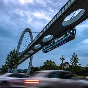 5月9日拍攝的武漢“光谷光子號”空軌列車(chē)??哲壛熊?chē)車(chē)體懸掛于軌道梁下方凌空“飛行”,具有不占用地面路權、環(huán)境適應性強等優(yōu)點(diǎn),兼具通勤和觀(guān)光功能。
