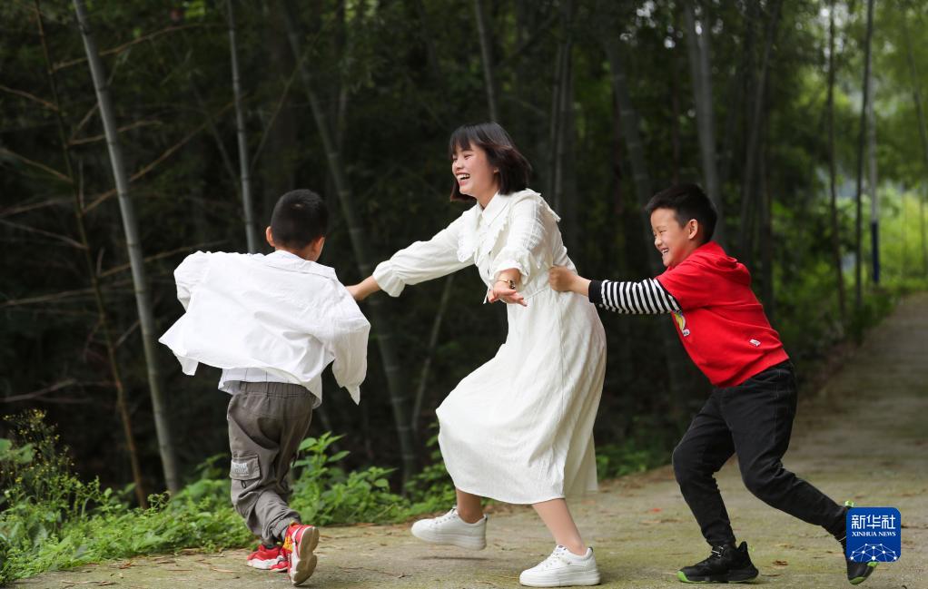 5月13日,在貴州省黔東南苗族侗族自治州岑鞏縣思旸鎮龍江村,一位母親與兩個(gè)兒子做游戲。